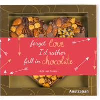 Ben je op zoek naar een origineel geschenk waarop je je foto kunt laten bedrukken? Wat dacht je hiervan: Wie ga jij verrassen met Valentijn? Hét ultieme cadeau om iemand de liefde te verklaren is natuurlijk dit chocoladehart van Australian. Je kunt kiezen uit overheerlijke pure- of melkchocolade. Beide smaken zijn gedecoreerd met luxe noten. Op dit design met cupido pijlen staat de humoristische tekst: ‘Forget love, I’d rather fall in chocolate’. Je kunt dit hart natuurlijk anoniem versturen, maar wil je dat je liefde niet onbeantwoord blijft, voeg dan onderaan je naam toe ;). Kortom: het perfecte Valentijnscadeau voor een echte zoetekauw als je het ons vraagt. Of om die lieve vriend of vriendin gewoon ‘zomaar’ mee te verrassen. Benieuwd naar onze andere love-designs van Australian? Bekijk hier alle Australian ‘love’ chocolate.