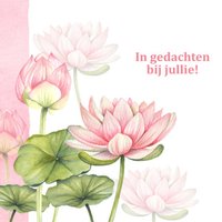 Ben je op zoek naar een origineel geschenk waarop je je foto kunt laten bedrukken? Wat dacht je hiervan: Condoleance kaart van Geertje Burgers met roze bloemen. Op de kaart zie je ook de tekst: In gedachten bij jullie!