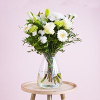 Ben je op zoek naar een origineel geschenk waarop je je foto kunt laten bedrukken? Wat dacht je hiervan: Wil jij iemand tijdloze bloemen bezorgen? Boeket Sereen is dan perfect om te versturen! De combinatie van de verschillende witte bloemen geven het arrangement een tijdloze uitstraling. Een sereen boeket dat in vrijwel elk interieur past en geschikt is voor verschillende gelegenheden. Met dit prachtige handgebonden boeket kan je iemand feliciteren of een hart onder de riem steken. Waarom Greetz: Dit boeket is te bestellen met jouw persoonlijke boodschap op een kaart of minikaartje naar keuze. Wij bezorgen onze bloemen vers van de veiling. Op water bezorgd en geleverd met snijbloemvoeding. Bloemen verzorgingstips: Gebruik een schone vaas, bij voorkeur van glas. Zo kan je goed het waterniveau in de gaten houden. Voeg snijbloemenvoedsel toe aan het water en verwijder het overtollig blad van de stelen. Het elastiekje mag om het boeket blijven zo behoud het boeket zijn vorm. Ben je op zoek naar meer informatie over de verschillende bloemsoorten? Vind hier alles over o.a. verzorgingstips, combinaties, kleuren en betekenissen. Boeket samenstelling: 3 witte rozen 2 witte germini 1 witte lelie 1 witte chrysant 3 witte tros anjers 3 groene anjers Divers sierblad