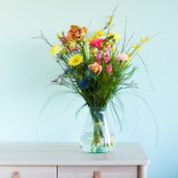 Ben je op zoek naar een origineel geschenk waarop je je foto kunt laten bedrukken? Wat dacht je hiervan: Op zoek naar een sprankelende verrassing? Boeket Sprankelend is een lekker los gebonden boeket met verschillende kleur tinten. Alsof je de bloemen zo vers van het veld geplukt hebt. Wij hebben deze speciale stelen met zorg samengesteld en hier een mooie veldboeket van gemaakt. Maak de verrassing compleet met een persoonlijke boodschap op een kaart. Wie maak jij blij met dit boeket? Waarom Greetz: Dit arrangement is te bestellen met jouw persoonlijke boodschap op een kaart of minikaartje naar keuze. Wij bezorgen onze bloemen vers van de veiling. Op water bezorgd en geleverd met snijbloemvoeding. Bloemen verzorgingstips: Gebruik een schone vaas, bij voorkeur van glas. Zo kan je goed het waterniveau in de gaten houden. Voeg snijbloemenvoedsel toe aan het water en verwijder het overtollig blad van de stelen. Snij 2 tot 3 cm van de onderkant van de stelen schuin af met een scherp mes. Ben je op zoek naar meer informatie over de verschillende bloemsoorten? Vind hier alles over o.a. verzorgingstips, combinaties, kleuren en betekenissen Boeket samenstelling: 1 roze leeuwebek 2 gele anjers 1 blauwe distel 1 zalm Amaryllis 1 roze lysianthus 1 roze/oranje roos 1 roze limonium 1 roze germini 1 gele germini 2 gele forsitis Divers sierblad en gras