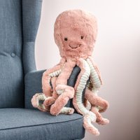 Ben je op zoek naar een origineel geschenk waarop je je foto kunt laten bedrukken? Wat dacht je hiervan: Deze heerlijk zachte Jellycat Odell octopus heeft 8 armpjes om mee te knuffelen. Deze prachtige steenrode octopus heeft daarom enrom veel liefde om te geven. Met zijn vriendelijke, dommige glimlach en heldere glanzende ogen is deze octopus een lust voor het oog. Deze octopus geeft ongetwijfeld de beste knuffels van de hele oceaan. Jellycat Odell octopus Materiaal: polyester Afmeting: 49 cm Geschikt vanaf de geboorte