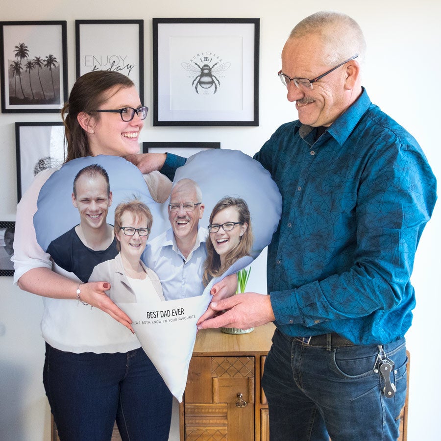 Ben je op zoek naar een origineel geschenk waarop je je foto kunt laten bedrukken? Dan zou dit iets voor je kunnen zijn: Een zacht hartvormig kussen voor papa, volledig bedrukt met jouw ontwerp. Echt persoonlijk met foto, collage of design op beide zijden.