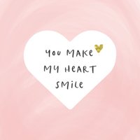 Ben je op zoek naar een origineel geschenk waarop je je foto kunt laten bedrukken? Wat dacht je hiervan: Mooie valentijnskaart van Tsjip. Op de kaart zie je een groot wit hart met een roze achtergrond. In het hart staat: you make my heart smile.